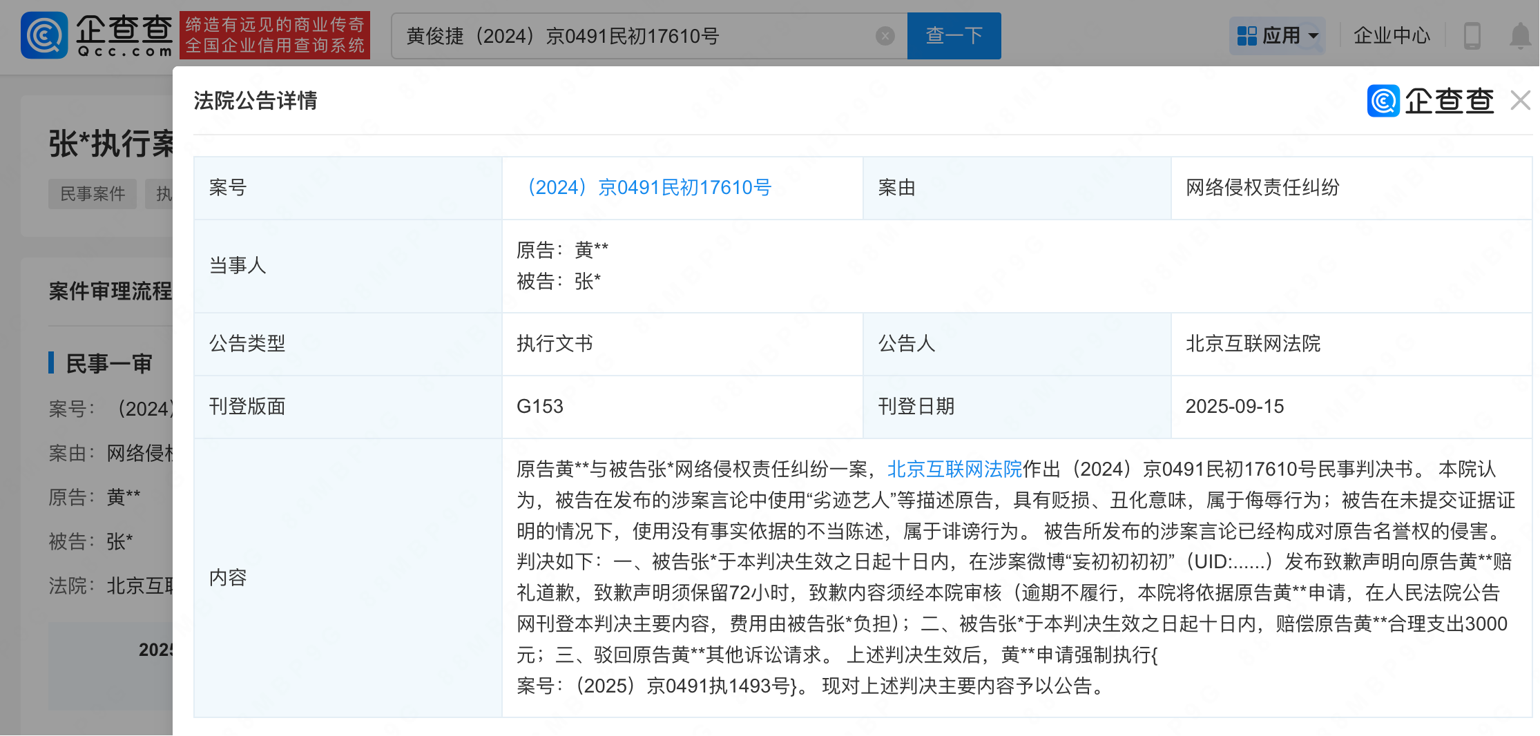 9月15日,法院刊登黄俊捷与被告张某网络侵权责任纠纷判决公告。内容显示,法院认为被告在发布的涉案言论中使用“劣迹艺人”等,具有贬损、丑化意味,属于侮辱行为;且没有事实依据的不当陈述,属于诽谤行为。法院判决被告在涉案账号向黄俊捷赔礼道歉,并赔偿合理支出3000元。上述判决生效后,黄俊捷申请强制执行。